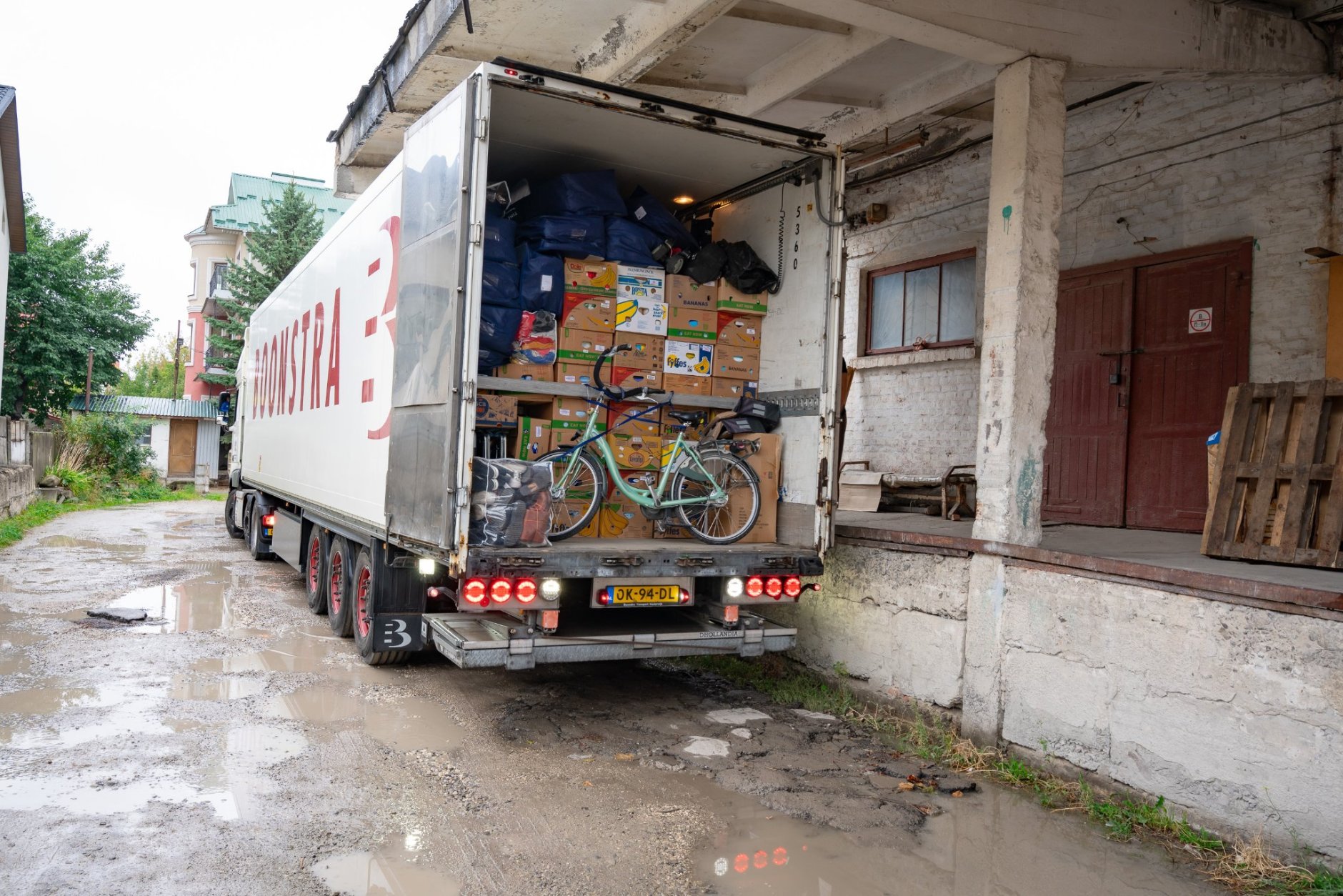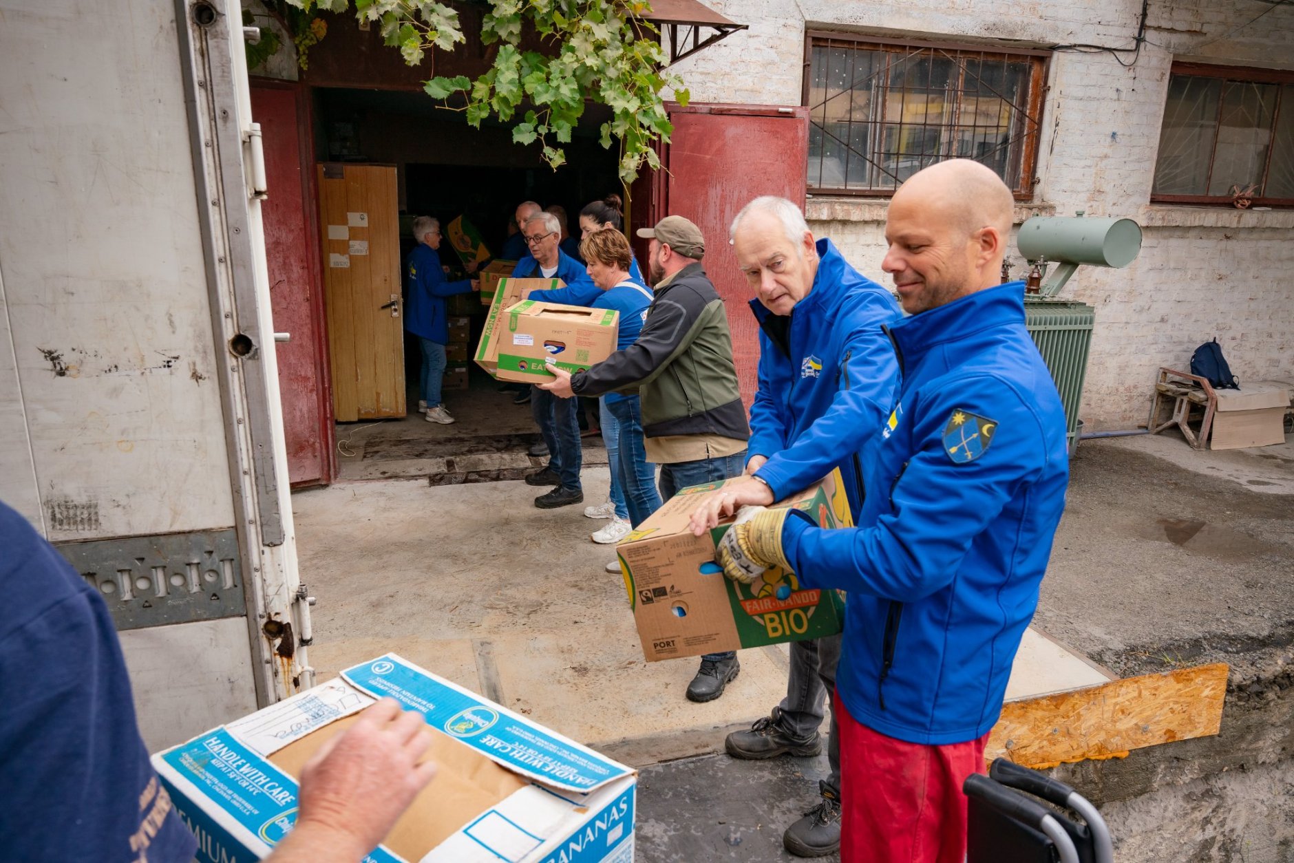 Maandagochtend lossen we de hulpgoederen bij de Oekraïense partner Open Door Foundation. Een deel gaat de opslag in; een ander deel vertrekt direct naar frontgebieden. Militairen en hulpverleners staan al klaar met busjes. De pallets bevatten voedselpakketten, medische goederen, noodgeneratoren en visnetten die straten afschermen tegen drones.